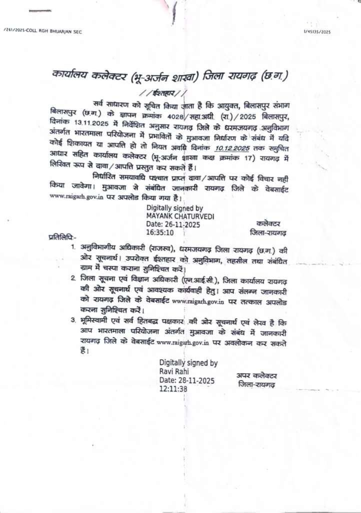 धर्मजयगढ़ में भारतमाला परियोजना: भूमि मुआवजा दावा–आपत्ति के लिए 10 दिसंबर तक मौका