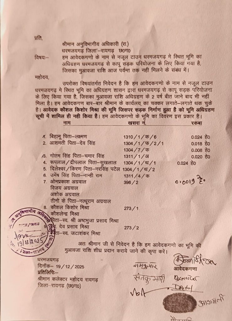 धरमजयगढ़–कापू सड़क परियोजना के लिए नजूल टाउन धरमजयगढ़ में स्थित निजी भूमि का अधिग्रहण किए जाने के दो वर्ष बीत जाने के बाद भी पीड़ित भू-स्वामियों को अब तक मुआवजा राशि का भुगतान नहीं किया गया है। इससे आक्रोशित ग्रामीणों ने अनुविभागीय अधिकारी (रा.) धरमजयगढ़ को आवेदन सौंपकर शीघ्र मुआवजा दिलाने की मांग की है,पीड़ित भू-स्वामियों का कहना है कि शासन द्वारा सड़क निर्माण हेतु उनकी भूमि का अधिग्रहण कर लिया गया, सड़क भी बनकर तैयार हो गई, लेकिन मुआवजा भुगतान की प्रक्रिया आज तक पूरी नहीं की गई। ग्रामीण लगातार एसडीएम कार्यालय के चक्कर काट रहे हैं, परंतु उन्हें केवल आश्वासन ही मिल रहा है,सबसे गंभीर मामला यह है कि आवेदक कौशल किशोर मिश्रा की वह भूमि, जिस पर सड़क निर्माण किया गया है, उसे भूमि अधिग्रहण सूची में ही शामिल नहीं किया गया, जिससे मुआवजा मिलने में बड़ी बाधा उत्पन्न हो रही है।